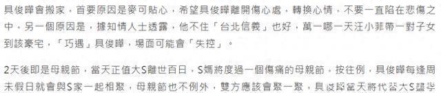 这座豪宅承载着两东说念主婚配生涯的点滴:从客厅到卧室吊挂着多幅大S生前像片,具俊晔婚后三年除责任外险些未尝离开内助身边,更逐日切身下厨准备三餐,以致常将餐点端至卧室让卧床疗养的大S享用。知情者描摹其"宠妻进度令身边东说念主叹为不雅止"。 跟着母亲节周边(恰逢大S百日祭),S家将迎来情谊双重素质。按旧例,具俊晔每逢周末齐会与徐家东说念主团员,这次母亲节他仍将如约追随S妈黄春梅,代替一火妻尽孝说念。